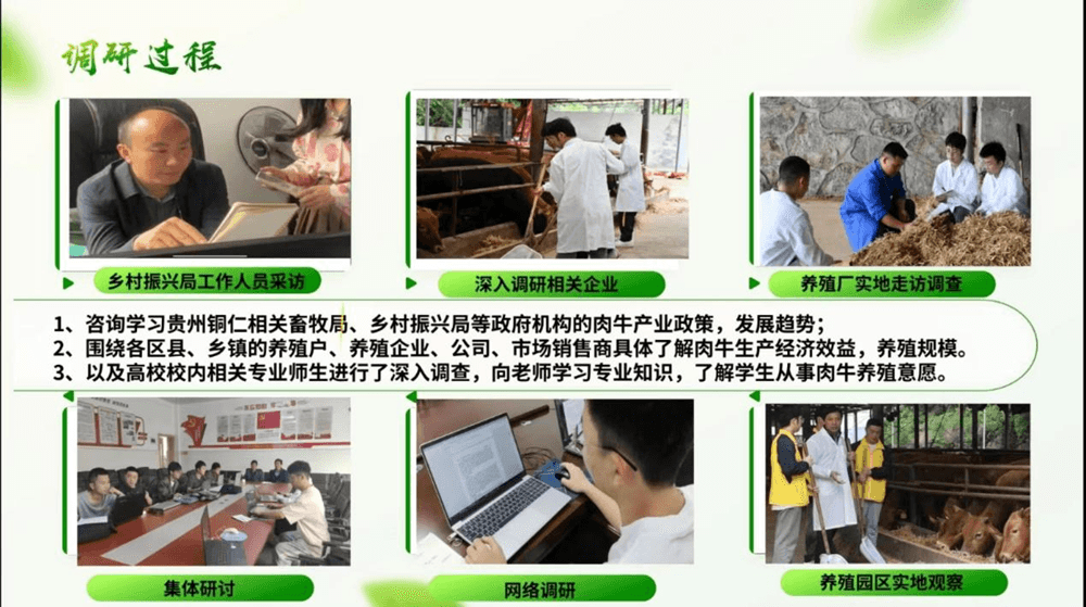 项目简介:随着我国经济的高速发展,人民对于高端生态牛肉的需求越来越大,其中雪花牛肉逐渐成为消费者追捧的目标。本项目基于贵州土黄牛生产高端生态雪花牛肉,2022年成立雪花贵牛大学生实践服务团队,采用实地访谈法、数据分析法、问卷调查法等调查方法,对各区县、乡镇的养殖户、养殖企业、市场销售商等主体进行了深入调查。对比国外雪花牛肉产业现状,剖析国内的雪花牛肉发展形势和发展机遇,为贵州黄牛产业发展提出带动乡村致富引领模式,借助贵州特殊的地理条件发展“小规模,大群体”的农户合作模式;优化环境凸显“小环境,大生态”等可行性对策和建议,为乡村振兴贡献职教力量。