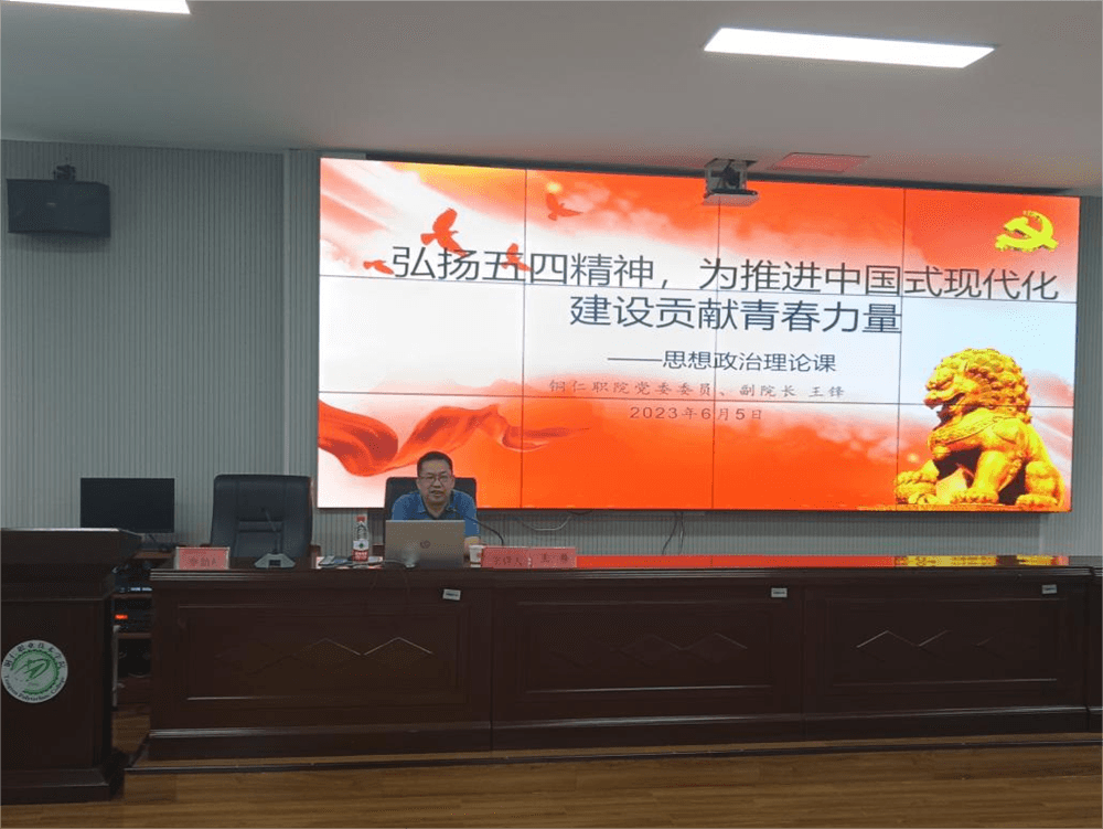 6月5日,学院党委委员、副院长王锋教授在学术报告厅为工学院师生上题为“弘扬五四精神,为推进中国式现代化建设贡献青春力量”的思政课,工学院党总支书记周章明主持,无课师生代表到场聆听。
