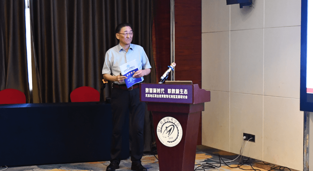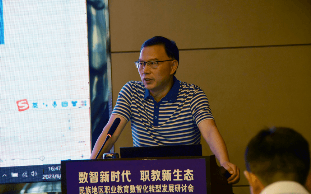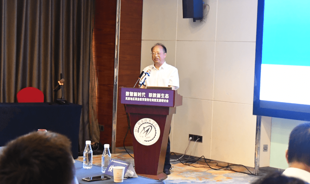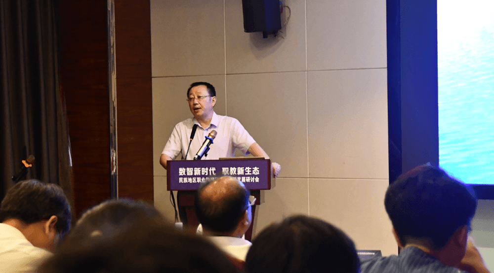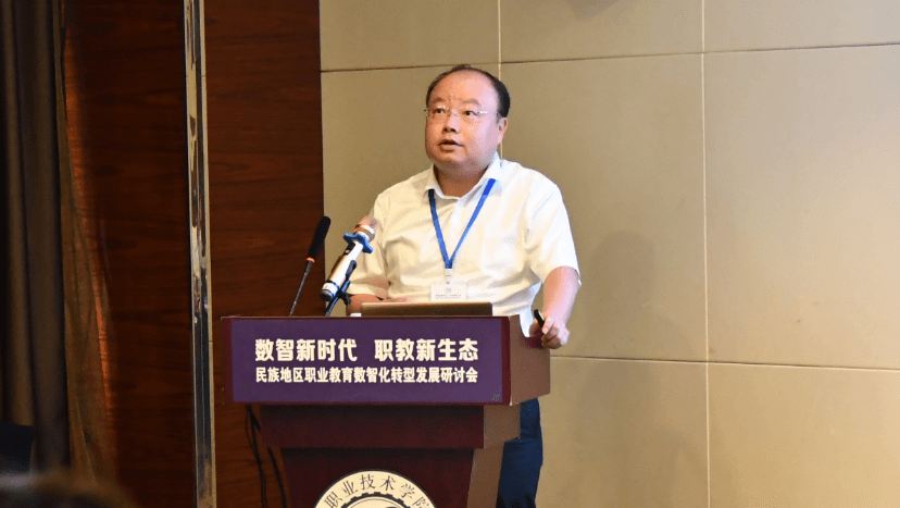 教育部职成司职业院校发展处处长任占营在致辞时向研讨会的召开表示热烈祝贺。他指出,要深化对职业教育和教育数字化的认识,围绕个性化人才培养,提高人才培养质量,满足学生个人和产业发展需要。要充分用好民族地区职业教育工作委员会平台,在教育数字化转型的新赛道上努力奔跑,把民族地区职业教育办出特色水平。