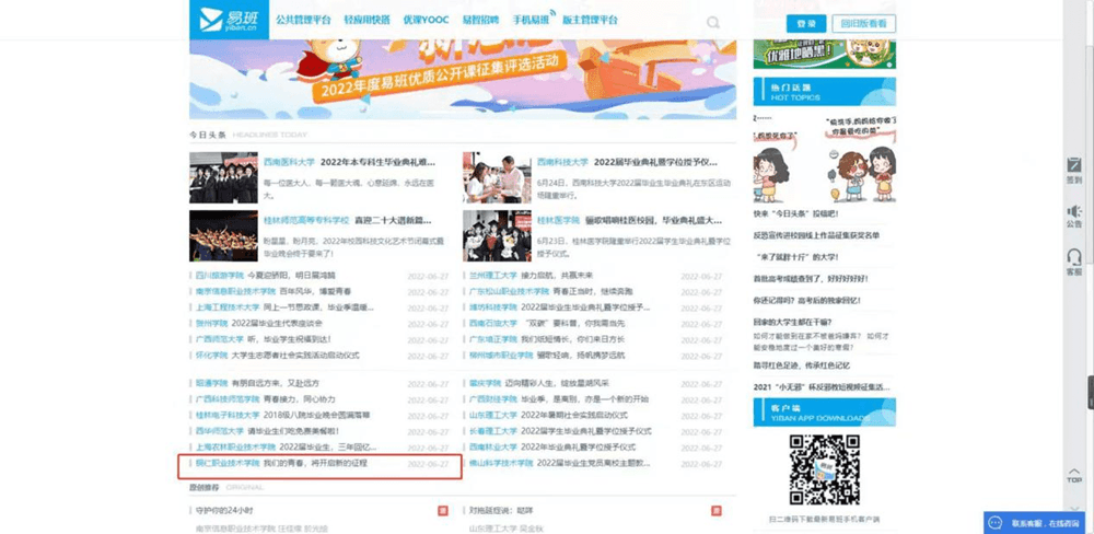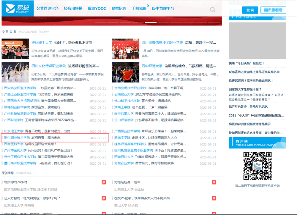 6月6日至6月29日,时珍社区易班相继推出“‘525’与心灵相约,与健康同在”、“燃烧青春,踏向未来”、“我们的青春,将开启新的征程” 、“易起迈向新征程”推文接连4次荣登全国易班今日头条,这也是本月取得最好的分站,感谢时珍社区全体易班成员的辛苦付出,也祝愿我院易班再接再厉,再创辉煌。6月15日与25日,五美社区易班推出的“喜迎二十大、奋斗正青春”与谷雨社区易班推出的“凝聚师生力量,共展青春风采”推文也被易班网选中,荣获本月易班头条。