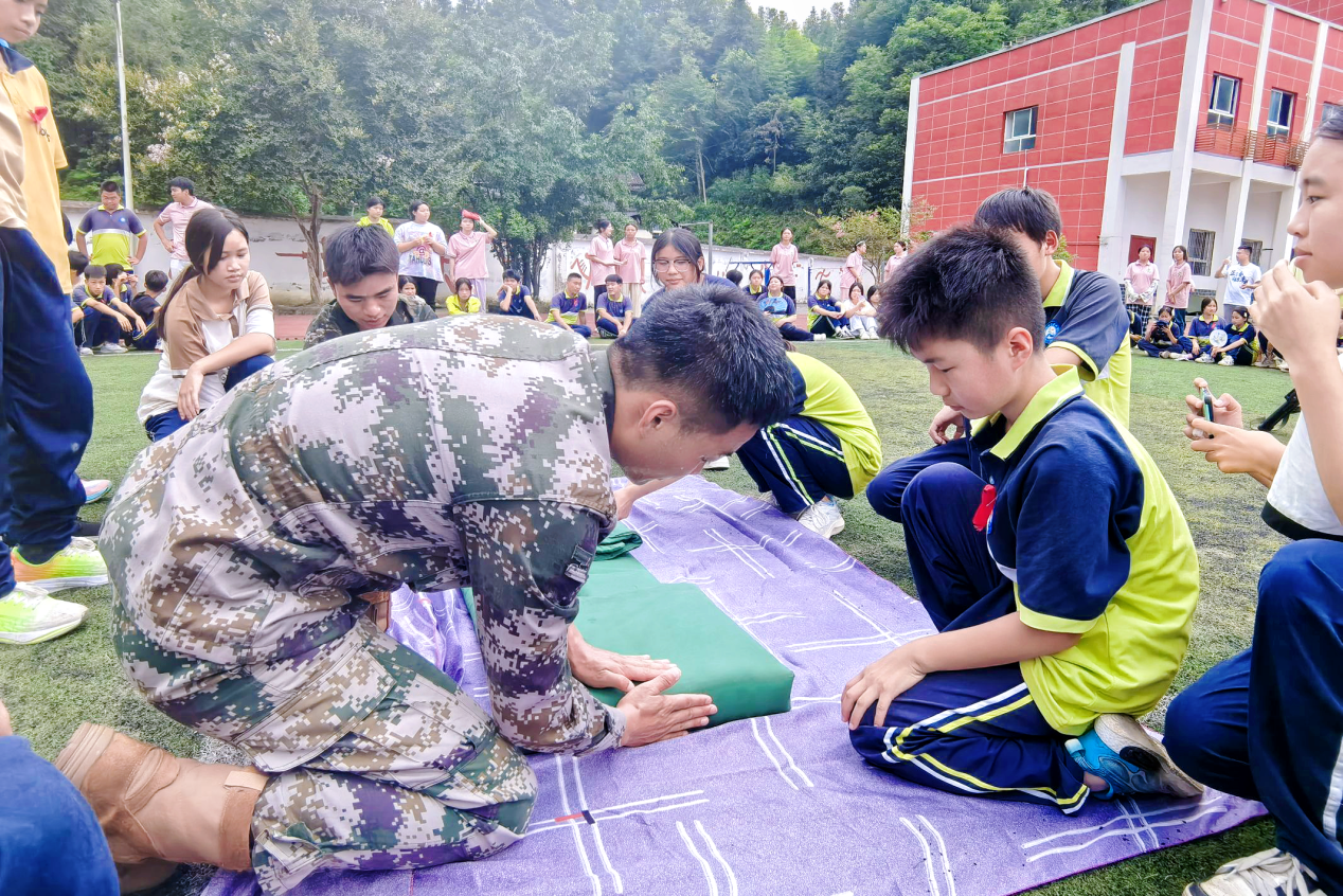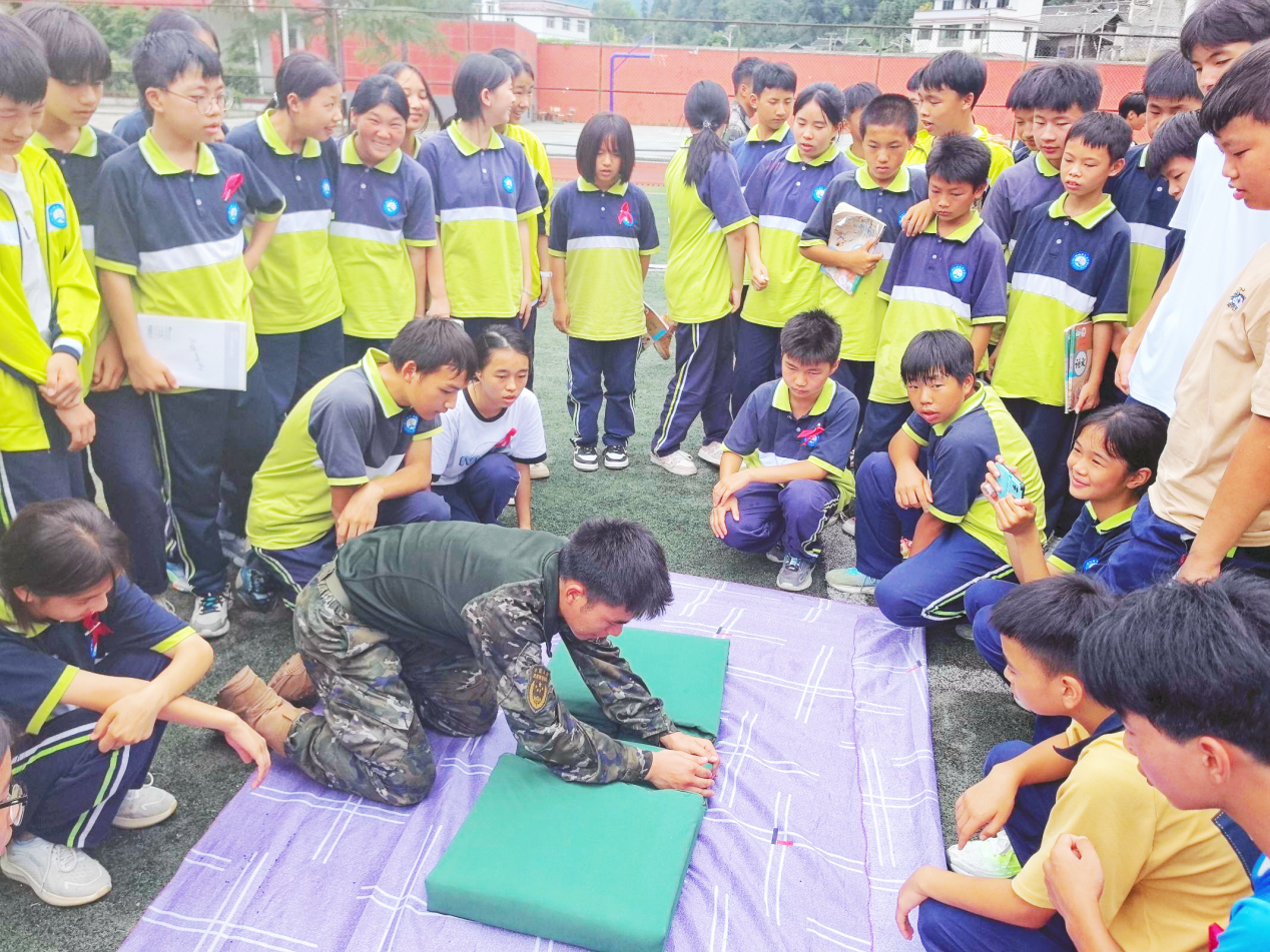 为了让孩子们更直观地感受军事文化的魅力,退役军人们还现场演示了擒拿对抗、战术基础动作等军事技能,并邀请孩子们参与体验。在三名退役军人的指导下,孩子们认真学习每一个动作要领,虽然汗水浸湿了衣衫,但他们的脸上洋溢着满足和自豪的笑容。此外,叠军被和队列训练也让孩子们体验到了军队生活的严谨与纪律。