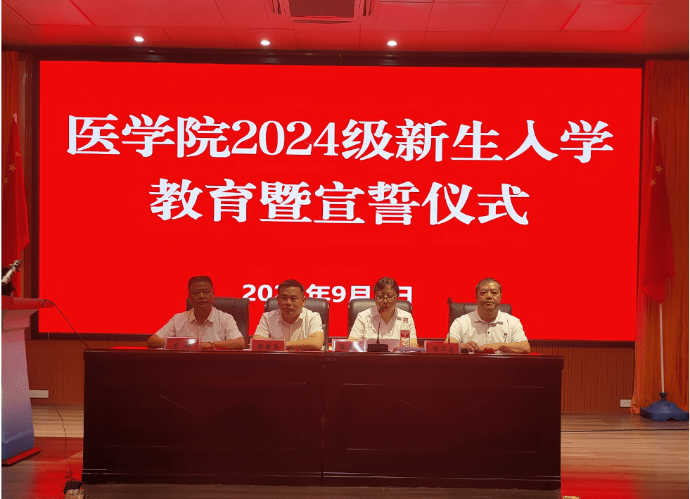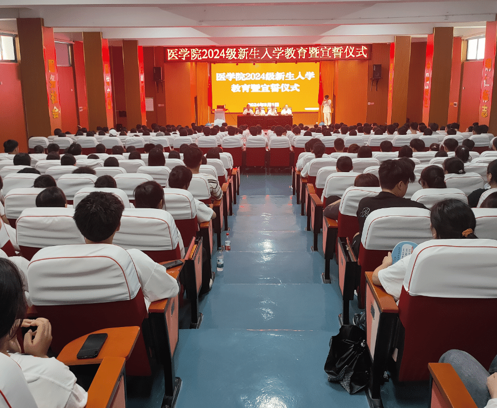 9月1日中午,医学院2024级新生入学教育暨宣誓仪式大会在学院寅亮厅隆重举行。医学院党总支书记胡国兵、院长徐友英、党总支副书记龙彬、副院长杨正志、各科室负责人、专业教研室主任、2024级全体辅导员及全体新同学参加大会。会议由党总支副书记龙彬主持。
