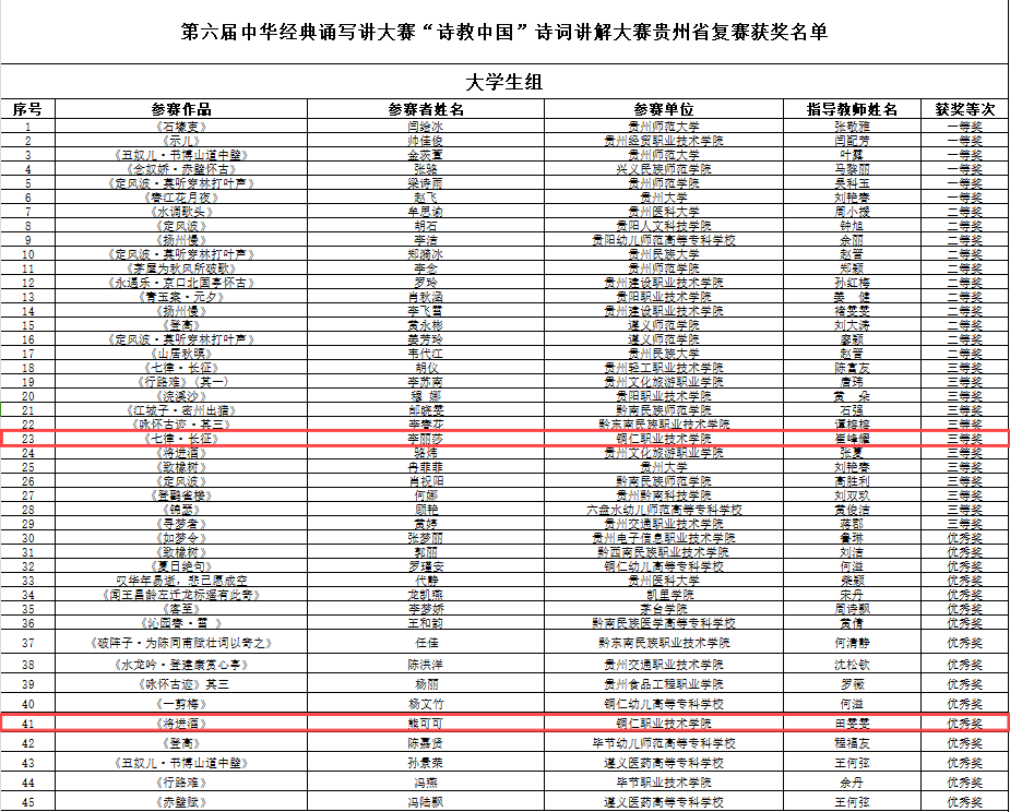 近日,贵州省教育厅公布2024年第六届中华经典诵写讲大赛贵州赛区初复赛获奖名单,我院学子喜获7个奖项,其中:“诵读中国”经典诵读大赛留学生组三等奖2项;“诗教中国”诗词讲解大赛大学生组三等奖1项、优秀奖1项;“笔墨中国”汉字书写大赛硬笔类大学生组优秀奖2项,软笔类大学生组优秀奖1项。