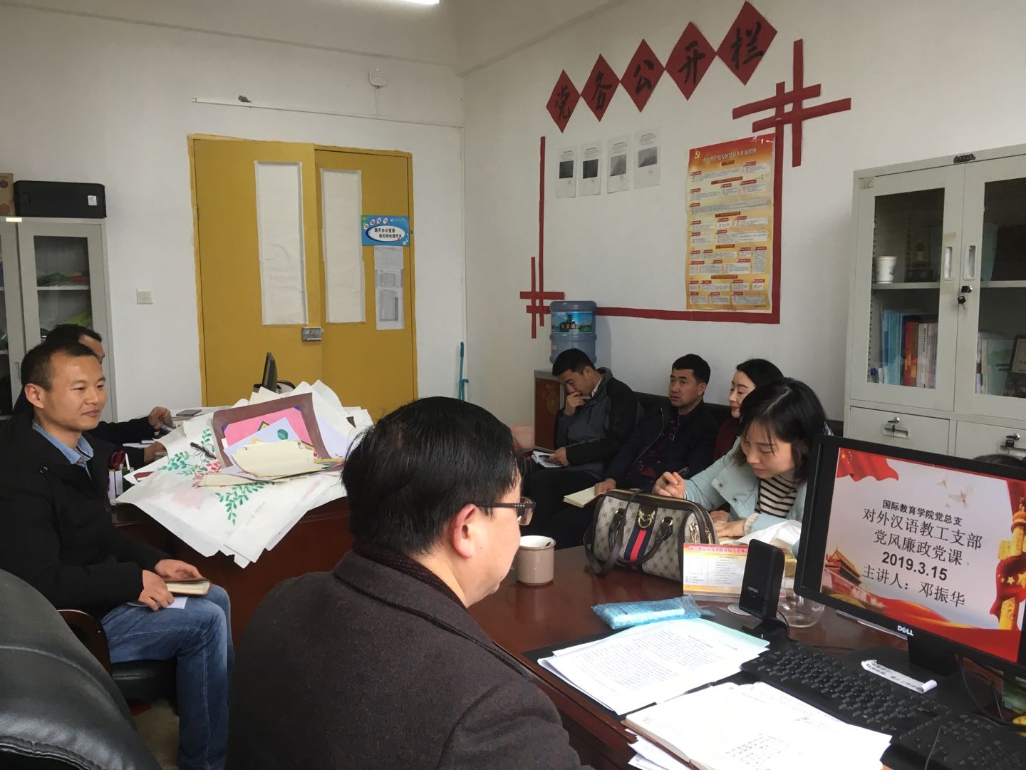 3月15日中午,国际教育学院党总支在C4-9召开廉政党课。本次党课由刘国强副书记主持,邓振华副院长以“加强党风廉政建设,构建反腐倡廉新常态”为题主讲,英语教工支部和对外汉语教工支部全体党员参加。
