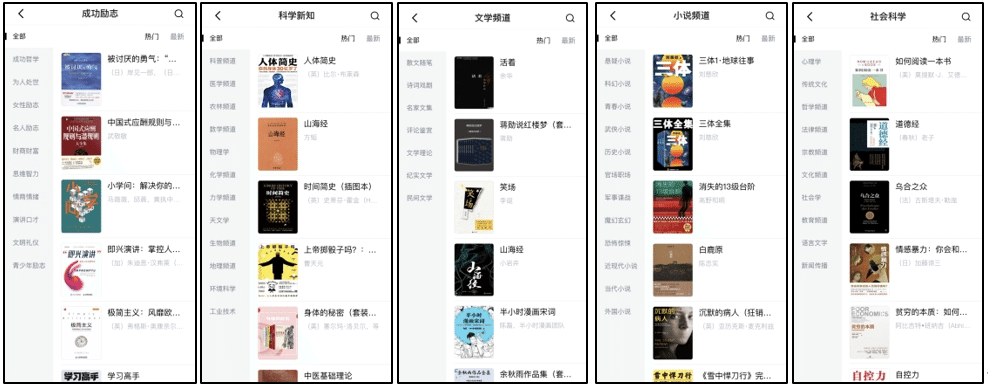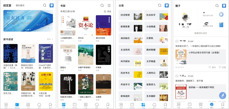 书籍分类: 京东读书专业版分类十分详细,共有22个一级分类,170个二级分类,每个分类再根据热门阅读及最新上架进行排序。找书十分方便。