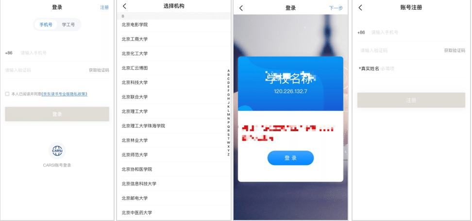 首次访问的读者需要连接校园网WiFi后,进入京东读书专业版平台,点击【注册】--选择【本人所在学校】--连接【校园网WiFi】完成身份认证,根据页面提示输入手机号、姓名等信息完成注册。