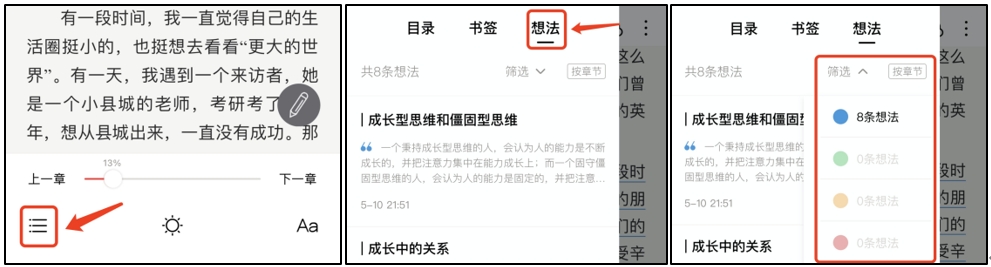 笔记定位:做了笔记想法需要时常回看复习,轻点屏幕中央唤出功能区,点击左下角目录,选择【想法】可查看该本书所有笔记,同时可以根据颜色分类选择想法。点击想法内容可直接跳转到原文相应位置。